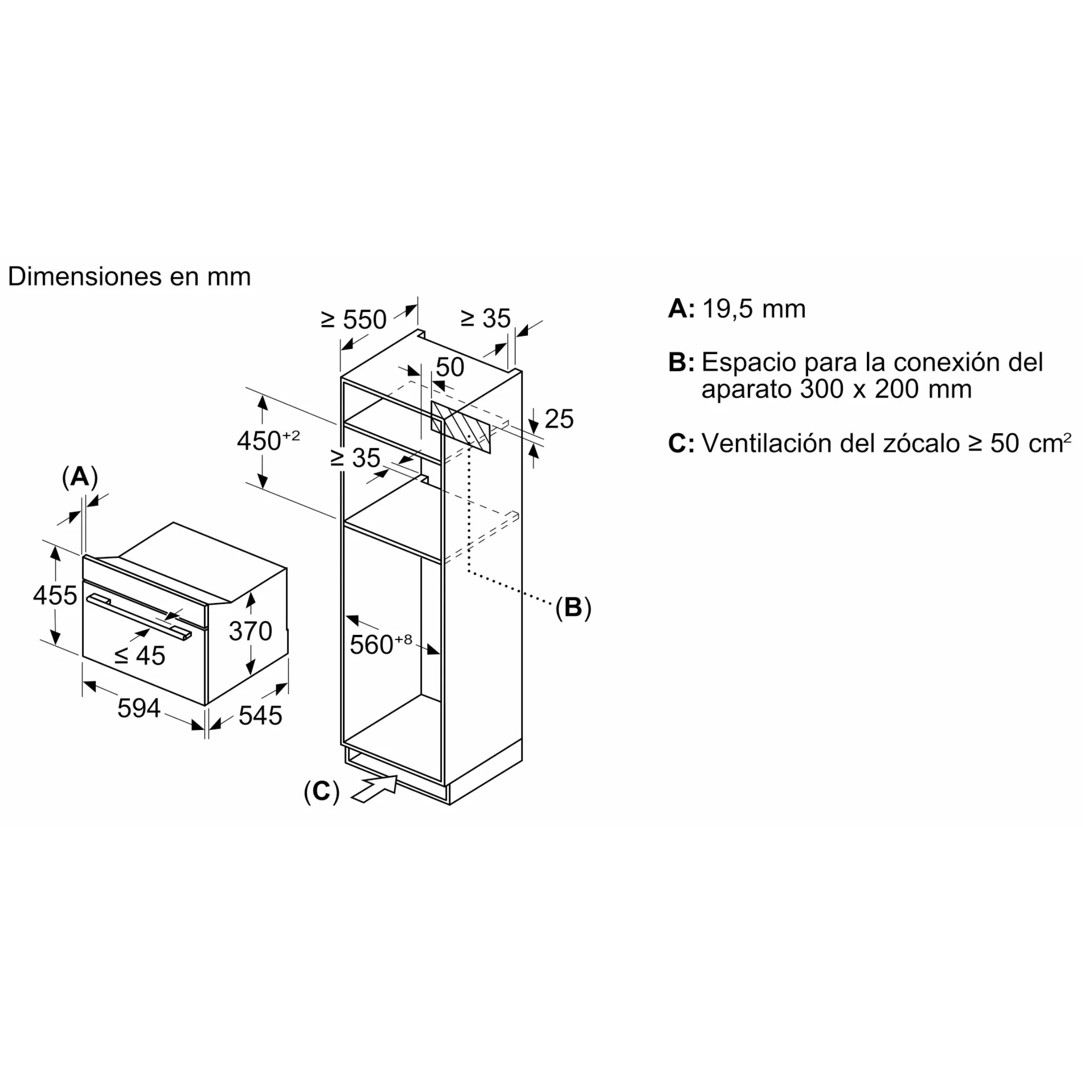 Dimensiones de encastre (alto x ancho x fondo): 450 x 560 x 550 mm.